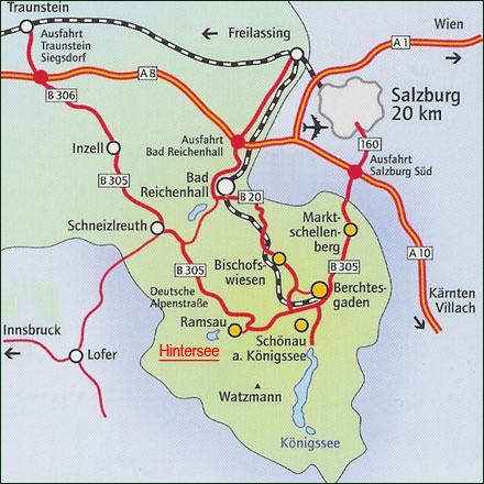 Verlassen Sie die A8 München-Salzburg an der Ausfahrt Traunstein/Siegsdorf. Über Inzell und Schneizlreuth gelangen Sie nach Schwarzbachwacht. Hier biegen Sie rechts Richtung Ramsau/Hintersee ab. Unser Haus liegt rechter Hand, direkt am Ufer des Hintersees.